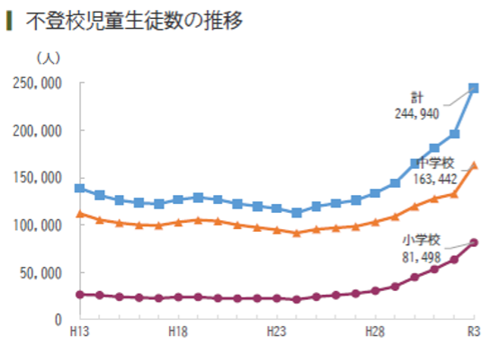 また、義務教育課程である小中学校に登校しない子どもたちの数が
