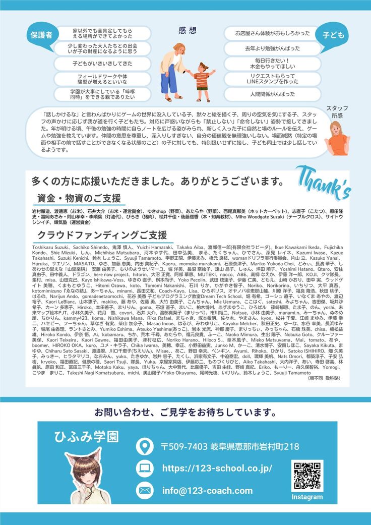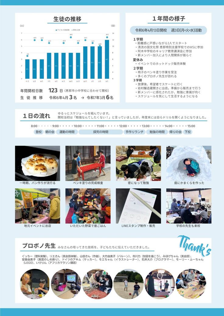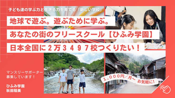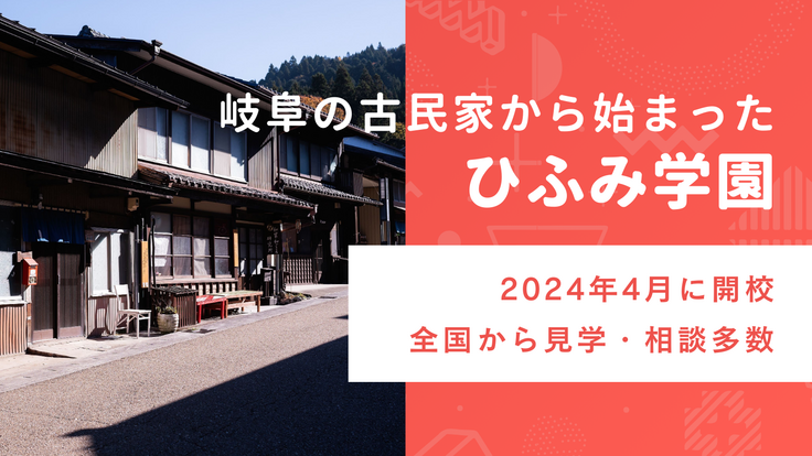 2024年4月、岐阜県恵那市に「ひふみ学園」開校。学校に行かない子どもたちが安心して過ごせる居場所として、自然体験や個別学習、対話を中心に活動を展開。これまでに全国から見学や相談が寄せられ、他地域での開校サポートも進行中。マンスリーサポーター制度を開始。