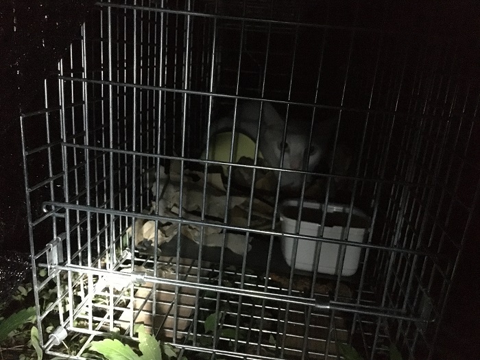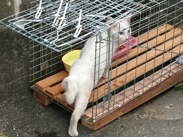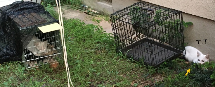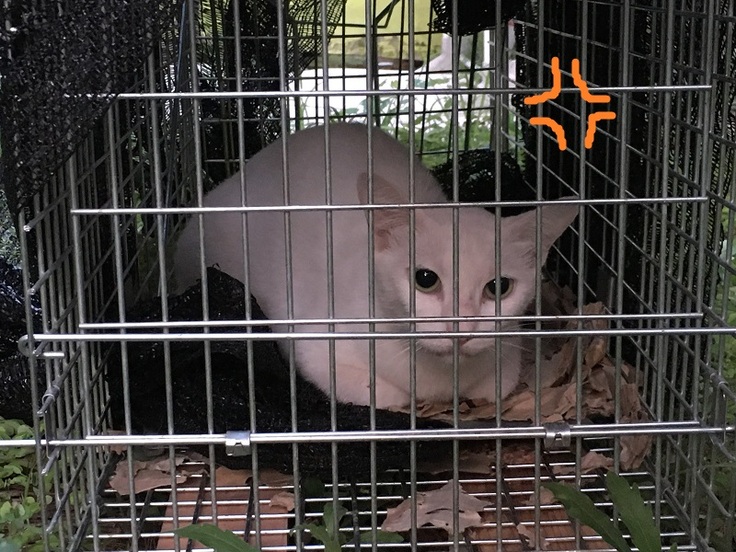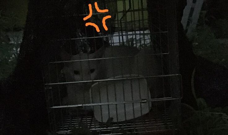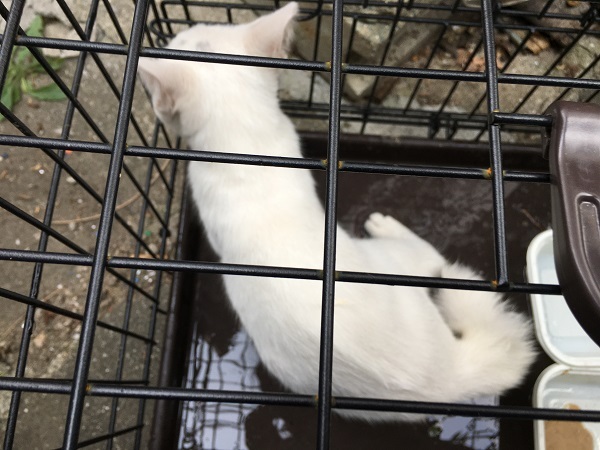この場所が猫たちにとってトラウマになってはいけないので、ママちゃんの入った捕獲器をよそのおうちの庭に移動させました。