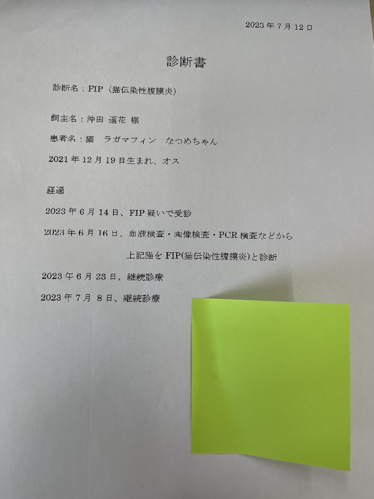 血液検査と胸水での遺伝子検査をしてもらいやはりFIPだという確定診断されました。