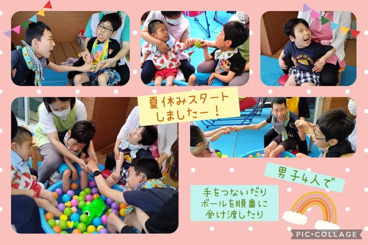 夏休みは、放課後等デイサービスのお子さんが10時からご利用になります。そのため、児童発達支援のお子さんたちと放課後等デイサービスのお子さんたちが一緒に過ごすことになります。(普段は、児童発達支援がお昼過ぎまでで、入れ違いで放課後等デイサービスのお子さんが学校から帰ってきます)