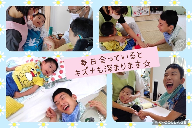 けいくんは、こうちゃんが側を通ると「こうちゃん」と声をかけてくれて、手を伸ばして「かわいい」とニコニコ。お布団が隣のときは、寝返りをしたりいざったりして近づいてきてくれます。こうちゃんもけいくんが来てくれてニコニコ(^^)