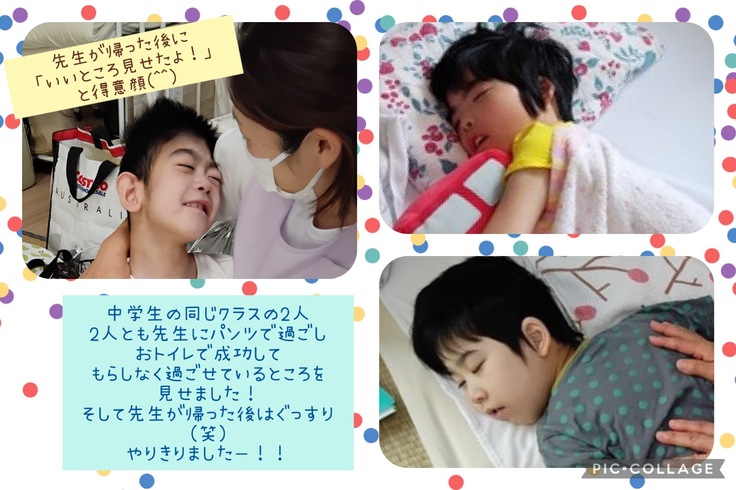 中学生のみーちゃんとりく君は、先生に夏休みは布パンツで過ごしていることを報告!2人とも、先生がいる間はおトイレで成功し、漏らしなし!!先生が帰った後は、2人で同じ方向を向いて爆睡。同じタイミングで漏れてしまいましたー。先生がいる間は、2人とも頑張ってたんだなぁ〜と。そして、その後の行動のシンクロっぷりに、2人の絆⁈を感じました(笑)