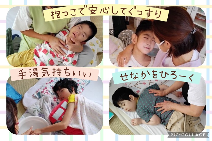筋緊張が強かったり、発作になったり、ゼロゼロして苦しくて落ち着かないとき等に、抱っこしてからだにやさしくふれると、筋緊張がふーっとゆるみ、発作が落ち着いたり、息が通って楽そうな表情をしてくれます。