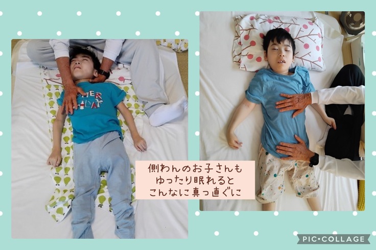 側弯のお子さんも、おなか・せなかにふれて、ゆっくり股関節も動かしたりすると、筋緊張が緩んで、こんなに真っ直ぐな姿勢で眠れるんです(^^)お迎えにきたママもビックリ!