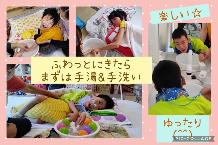 ふわっとに来たら、まずは感染予防で手洗いをします。その時の体調やお子さんに合わせて、座ったり、洗面器でしたり、洗面台をつかったり。みんなを眺めながら、洗面器にボールを入れてピチャピチャ手を動かしてニコニコ。大好きな先生に手を洗ってもらってニコニコ。洗面台の鏡にうつる自分にニコニコ(笑)。気持ちよくて手湯をすると眠ってしまうお子さんもいます(^^)