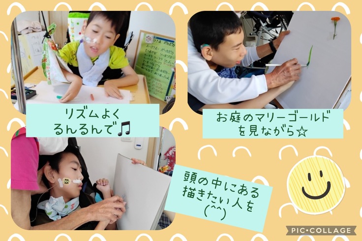 「ママを描いたら?」と職員が勧めると、「ちがう!」と怒って。その日にお誕生日だった年下の女の子と、弟を描きました。色も自分でしっかり選ぶことができて、ビックリ(^^)