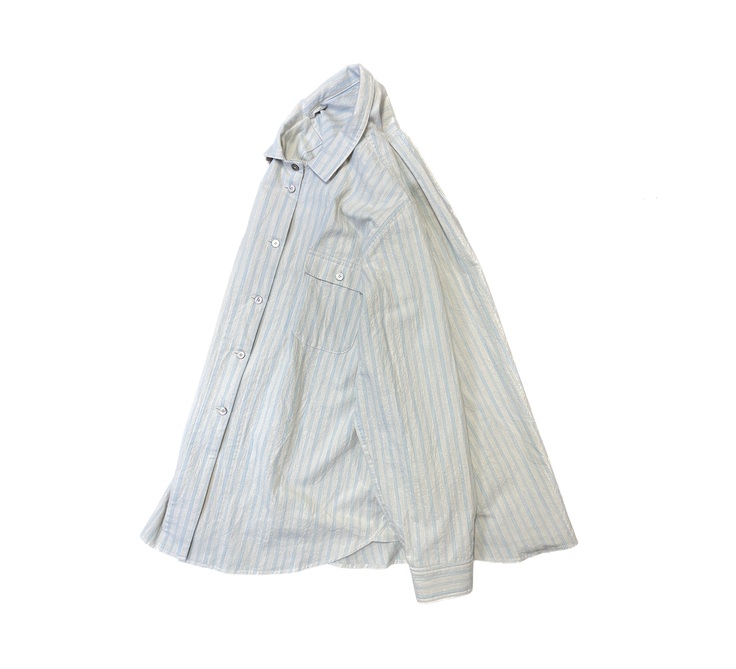 最初この生地を見つけた時はこの生地よりもう1トーン明るめの青ストライプでした。それもいいんだけど僕たちが好きなのはやっぱりビンテージアイテム、、 となるとあえて1トーン落とした色で生地を織ってもらって既にユーロビンテージのような風格が漂ってる。