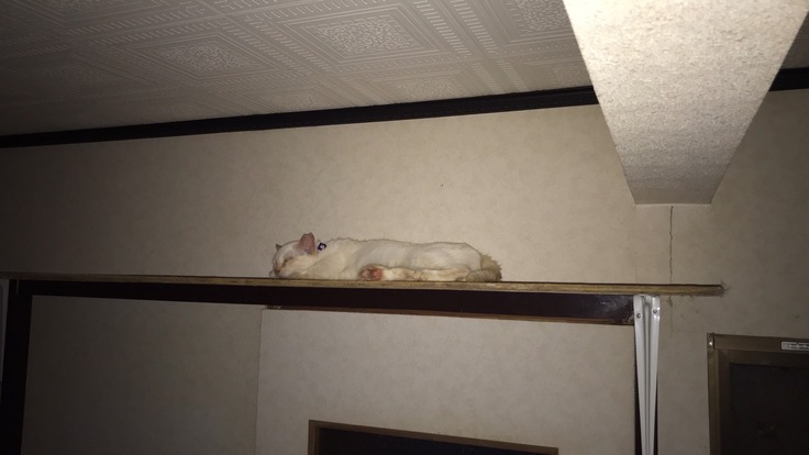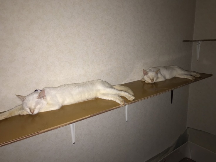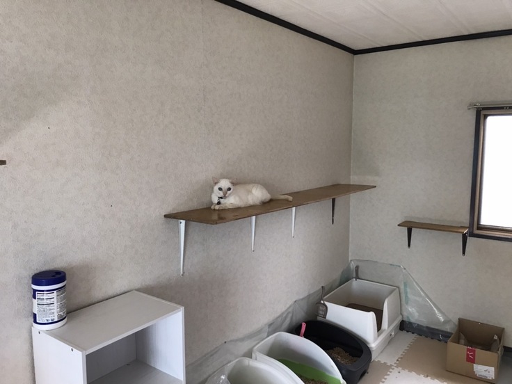 猫の数が多いせいか、上に登りたがるようなので、廃材を高いエコなキャットウォークを作ってもらいました。