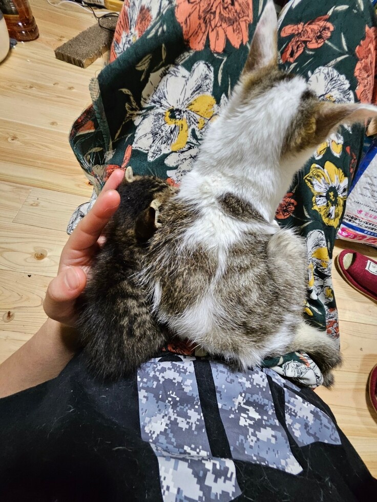 飼い主さんが長期出張で預かりをしている猫がいるのですが、その子がお母さん替わりをしてくれて、ずっと毛づくろいをしてくれています。その子もまだ小さい猫なのですが、母性本能とは凄い物です。