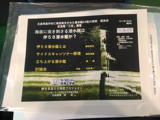7月8日(土)、今回のPJTにご協力いただいている九州工業大学社会ロボット具現化センター・浦環センター長が代表理事を務める「(一社)ラ・プロンジェ深海工学会」主催の講演会に行ってまいりました。場所は、横須賀にある記念艦「三笠」講堂、講演内容は、同会が行った五島列島沖合に海没処分された潜水艦24艦の調査結果の報告が中心です。マスコミにも取り上げられたためご存知の方も多いと思います。