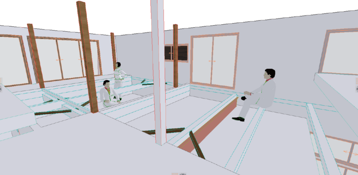 躯体を残しながら床のみを上下させることで、2Fの共用部の空間に多様な表情を与える案です。床を40cm下げた部分では躯体に座ることができ、80cm下げた場所では躯体がテーブルとなり、場所によってさまざまな活動を誘発します。