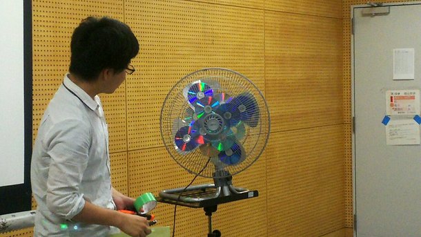 扇風機にたくさんCDを貼って光を当て回すときれいな虹が見えました!