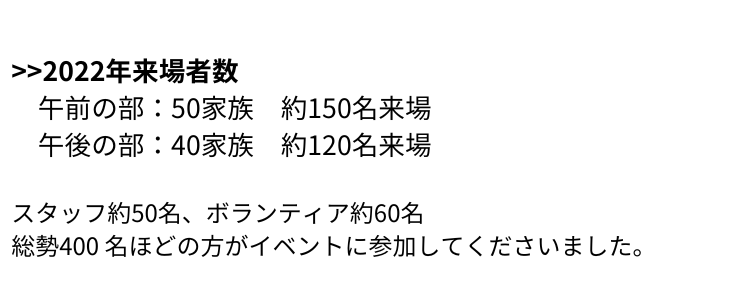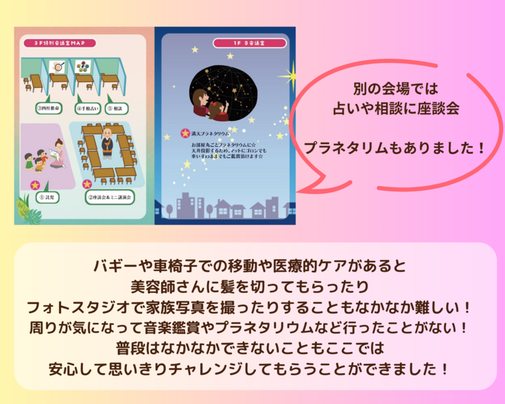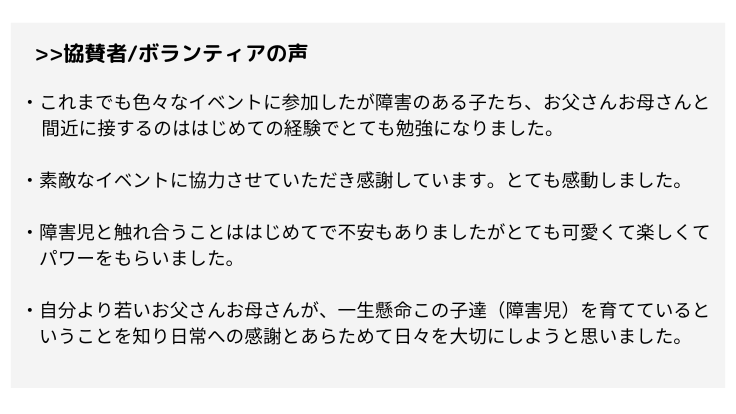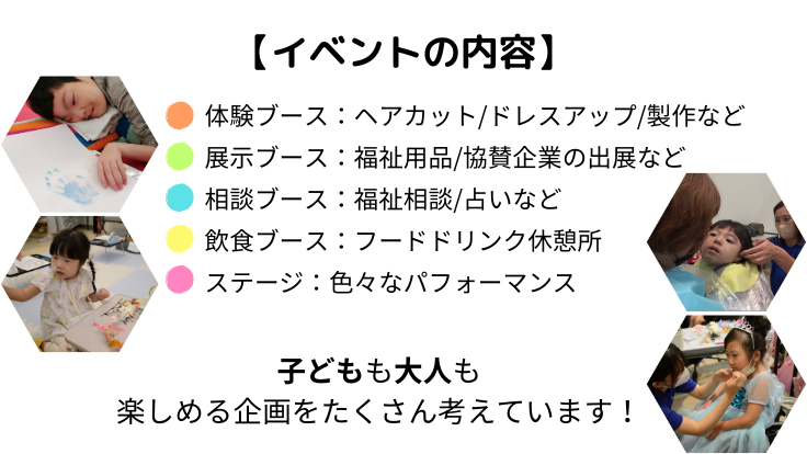 障害児とそのご家族を対象にイベントを開催するためのプロジェクト。普段公共の場に行きづらい課題を解消すべく、このイベントは誰が来ても気兼ねなく楽しめる場所を提供することを目指すプロジェクトの企画。 資金の使途:会場使用にかかる費用、会場備品のレンタル/購入費、イベントブース必要物品のレンタル/購入費