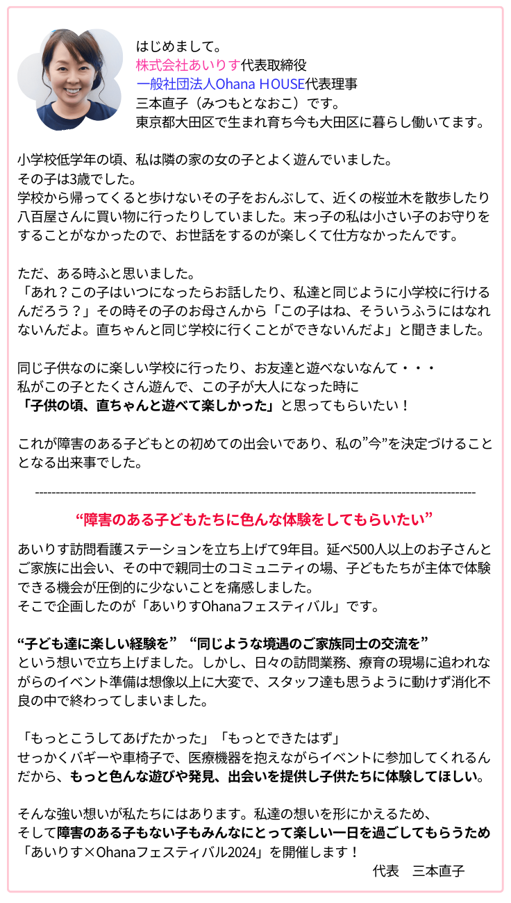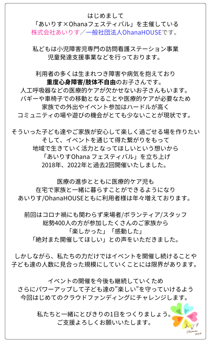 東京都大田区拠点に23区、千葉県、神奈川県の一部を対象に重症心身障害児や医療的ケア児を中心に訪問看護ステーション、保育所等訪問支援、相談支援、シッターサービスなど、お子様とご家族のためのトータルサポートサービスを運営しております。 どんな状況におかれた子ども達もその子らしく地域で生活できることを願いお子さまとご家族さまが安心して笑顔で暮らせるようサポートする、これが私達の共通の想いです。せっかくやるなら最高の時間を提供したい、何も気にすることなく思いっきり楽しみたい、それを感じてもらいたい。 初めてクラウドファンディングに挑戦します。 応援よろしくお願いいたします!!