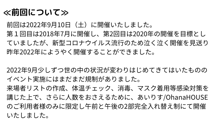 ▼新型コロナウイルス等感染症の流行、地震、台風などによる天災の影響などでやむを得ず開催ができない場合、延期時に皆様のご支援を活用させていただきます。ご返金は致しかねますので予めご了承ください。
