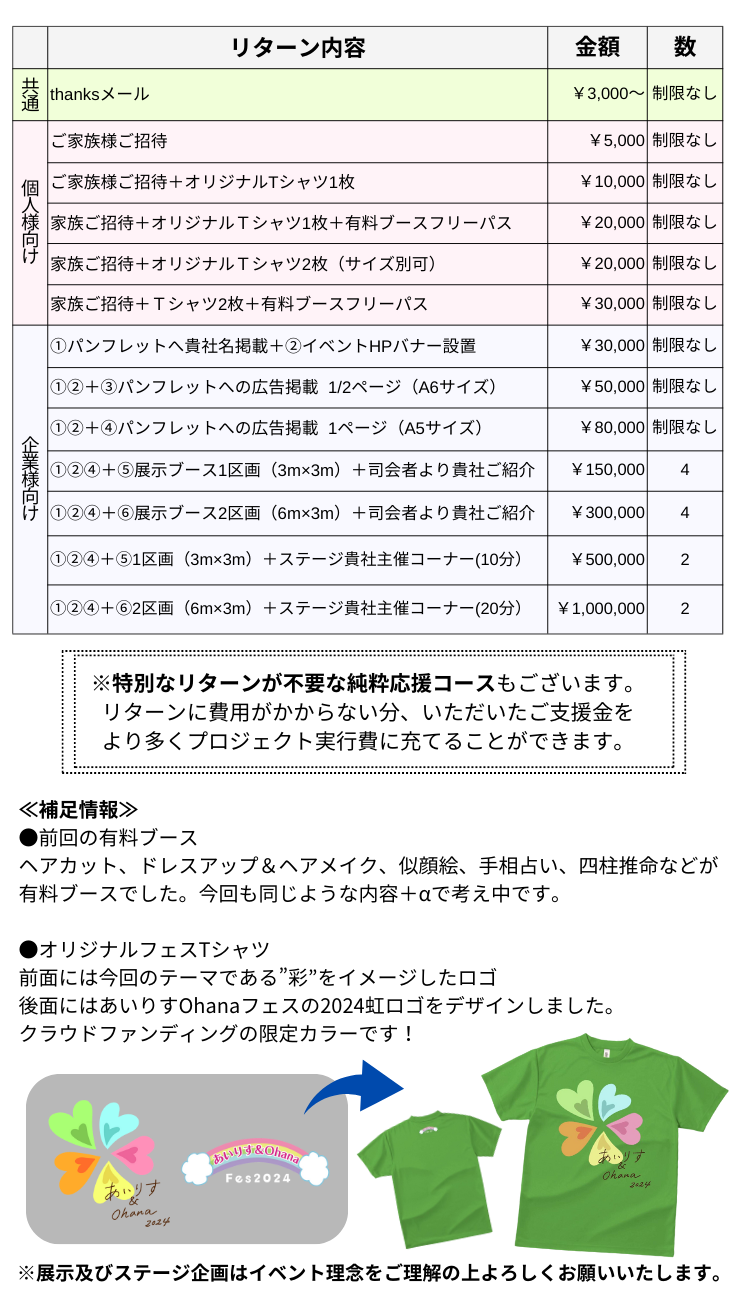 ▼リターンにつきましては、プロジェクト達成後のご支援コースの変更はできませんので予めご了承ください。