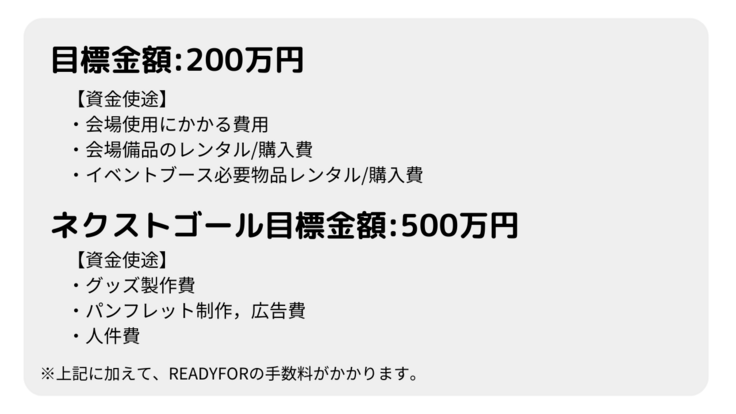 そして、現在着々と準備が進む中で、ネクストゴールを設置させていただくことといたしました。次の目標金額は500万円です。