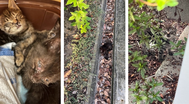 そう言われて駆け付けた先にいたのは、溝の中や枯葉の上に、音もなく横たわる子猫ちゃん。炎症で目が開かず、弱弱しく、殆ど動かない子もいました。子猫のまわりは蚊だらけ虫だらけ。