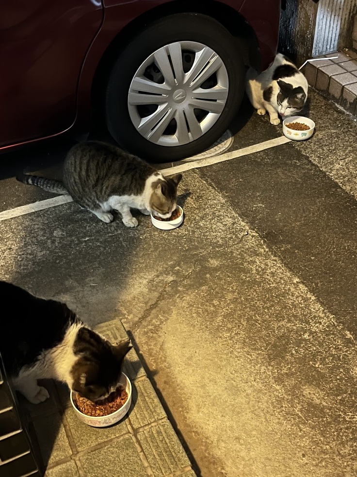 仕事から急いで帰宅しましたが、餌場に集まっているTNRM組の子たちは、寒さに震えながら、頑張って私の帰りを待っていました。こんな日は、いつもよりも更に大急ぎで、大至急!ご飯を用意して配ります。