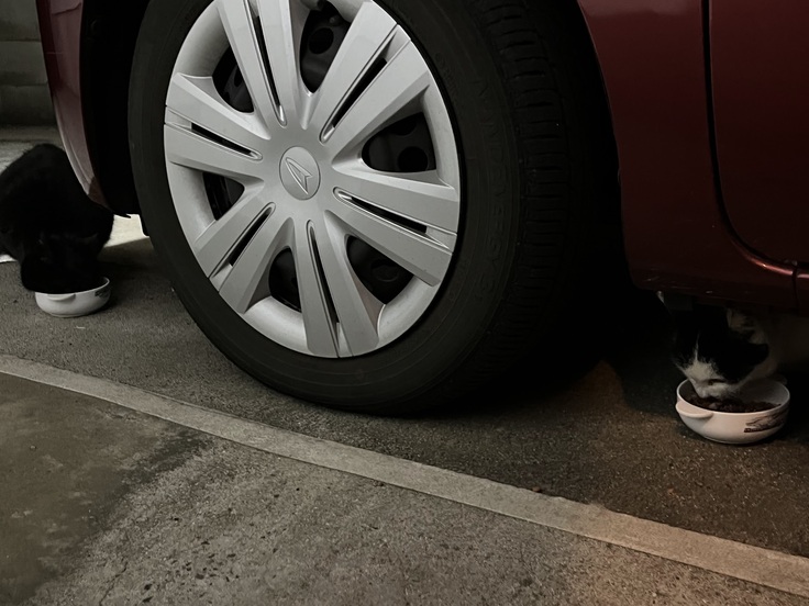 本当は、先に電子レンジで、ご飯を温めて出してあげたいとさえ思いますが、それをする間、更にお外で縮こまって待ってもらうのも過酷すぎるので、せめてもと、ウェットフードをモミモミ、手の熱で温めほぐしてから開封しました。それでも、やっぱり冷たいかなぁ…と思いながらも配っていくと、みんな一斉に黙々と食べ始めます。もう必死です。食べる方も大至急大急ぎです。