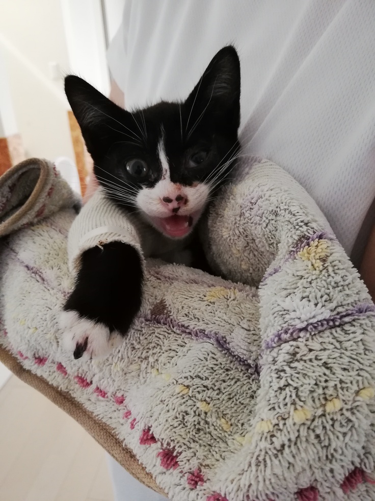 今年6月21日犬の散歩中に、草むらから尋常じゃない鳴き声するので行ってみると、右脇から大量な血と骨が出ている子猫を発見しました。