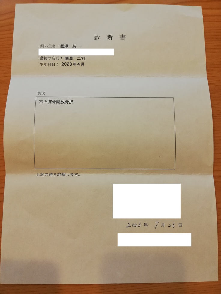 急いで動物病院へ連れていき、レントゲンの結果は開放骨折と診断され切断手術になりますと言われました。