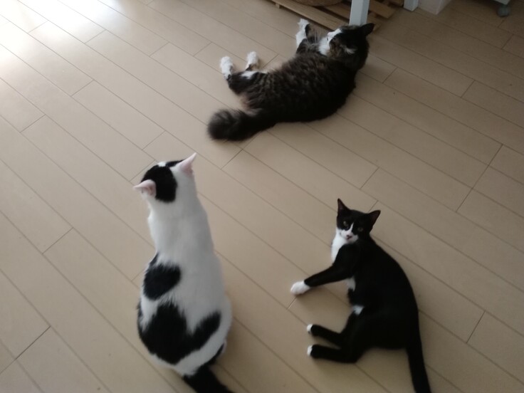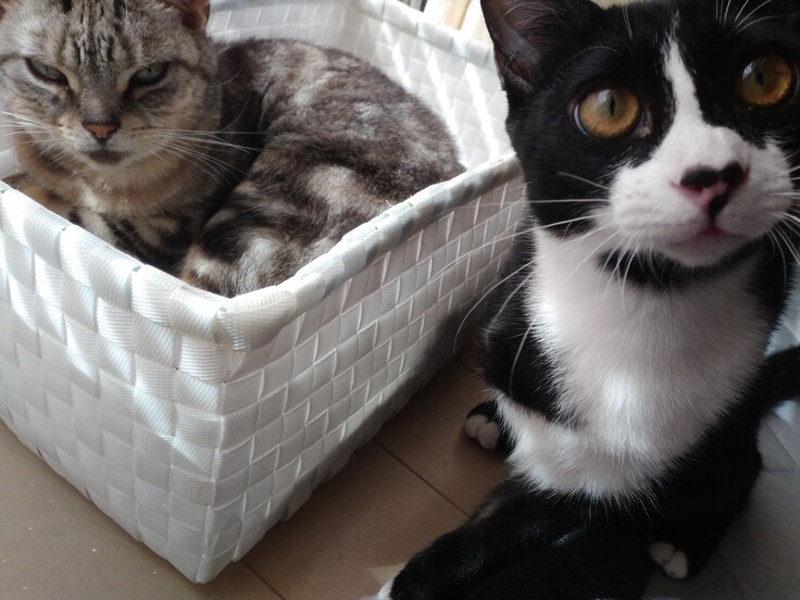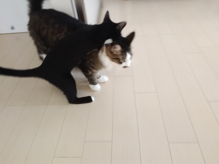ハンデのある猫が先住猫と暮らしていけるか不安でしたが、先住猫と仲良く元気に暮らしています。二羽が一番ほたえてます。