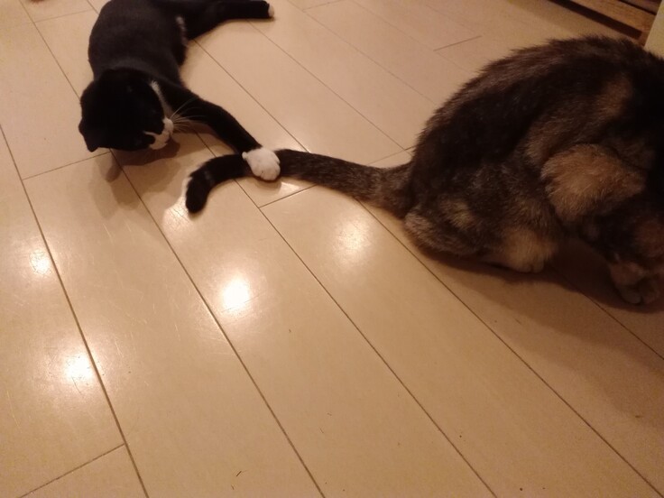 フクおにいちゃんが尻尾で遊んでくれてます。