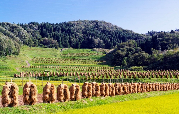 いま、大蕨棚田は棚田米がすくすくと育っています。2ヵ月後には黄金色の稲穂が風に揺れ、9月下旬には棚田に立ち並ぶ稲杭掛けの原風景が皆様をお迎えいたします。ぜひ、大蕨の棚田にお越しください。