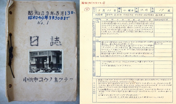今年、3年連続でヒナが産まれた「小浜市国富地区」は、日本で最後に野生のコウノトリのヒナが確認された地になります。最後にヒナが産まれた昭和39年(1964年)当時は、まだコウノトリが頻繁に飛来しており、住民や旧国富小学校の児童が観察や看板作成などの見守り活動に取り組んでいました。しかし、高度成長期の急激な環境破壊の影響か全国的に徐々に数が減り、国富地区からもコウノトリがいなくなってしまいました。当時の観察日誌には、「今日も姿が見えない・・・」と繰り返す児童のさみしい思いが伝わります。