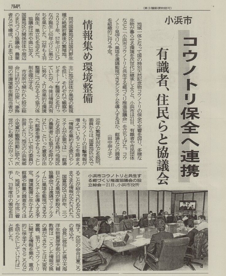 小浜市では、令和5年(2023年)2月に「コウノトリと共生する郷づくり推進協議会」を設置しました。