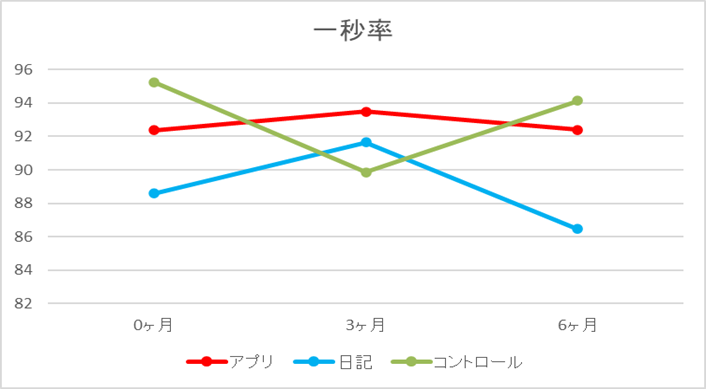 研究参加時、3ヶ月後、6か月後にスパイロメトリー、呼気一酸化窒素濃度(FeNO)を評価した。一秒率についてはアプリ群、日記群ともに3か月後に改善を認めたが、6ヶ月後には両群で低下した。FeNOについてはアプリ群では3か月後より低下を認めたが、日記群では3ヶ月後より上昇し、6ヶ月後に低下を認めた。