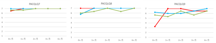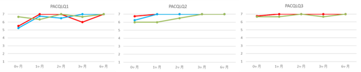 小児ぜん息患者の保護者の生活の質に関するアンケート(PACQLQ)を使用し、保護者のQOL評価を7段階で行った。(7、悩んだりすることはなかった 6ほとんど悩んだり心配することはなかった 5、少し悩んだり心配した 4、ある程度悩んだり心配した 3、かなり悩んだり心配した 2、非常に悩んだり心配した 1、極度に悩んだり心配した)質問2、4、6、8がぜん息による活動の制限についての質問で、それ以外が感情面についての質問である。研究参加後、すべての群で保護者のQOLの改善を認めた。特に、9お子さんがぜんそくを患っていることに悲しみを感じたり不条理だと思ったりした、11お子さんのぜんそくの薬とその副作用について、12ぜんそくのせいでお子さんに対してご自身が過保護になっていることについて、13ぜんそくの面でお子さんが今後ふつうの人生を送れるかどうかについてという質問に対しては喘息アプリ群で研究参加後1ヶ月には劇的な改善を認めた。6ヶ月後にはすべての群で保護者のQOLの改善を認めた。