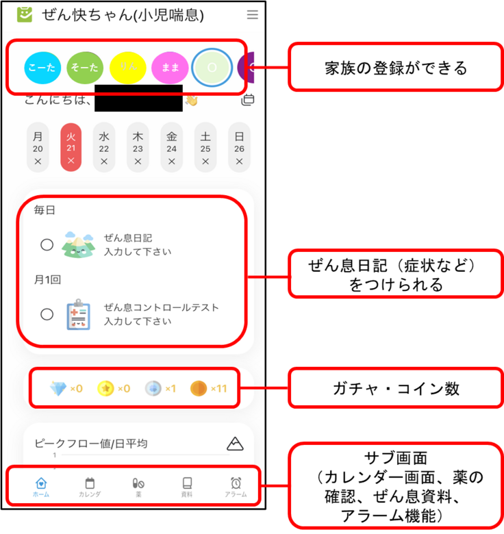 - 発作が頻繁に起きているときだけではなく、発作が起きていない時も必要な治療を毎日忘れずにできるようになることで、子供たちの未来の呼吸機能を守るため、我々は合同会社ウェルネスオープンリビングラボのご協力のもと、小児における気管支ぜん息に対するアプリケーション(以下「ぜん息アプリ」)を開発し、【ぜん息の子供たちが、快く過ごせますように】と祈りをこめ、「ぜん快ちゃん®(ぜんかいちゃん)」と名付けました。