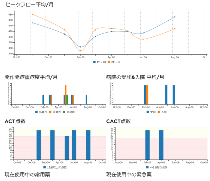 - 記入した内容を自分で確認する日記機能のみを搭載したアプリではないため、外来でスマートフォンを医療者に見せる必要はありません。医療者専用の画面では、医療者は自分の担当患者様のデータを確認でき、まとまったぜん息経過のデータがわかりやすく表示されるため、現在行われているぜん息治療の効果や患者の状態の把握がより行いやすくなります。この機能は、例えば遠隔診療を行う場面においても、より正確なぜん息診療をもたらす可能性があります。ほかにも、「ぜん快ちゃん®」には下記の機能が備わっています。