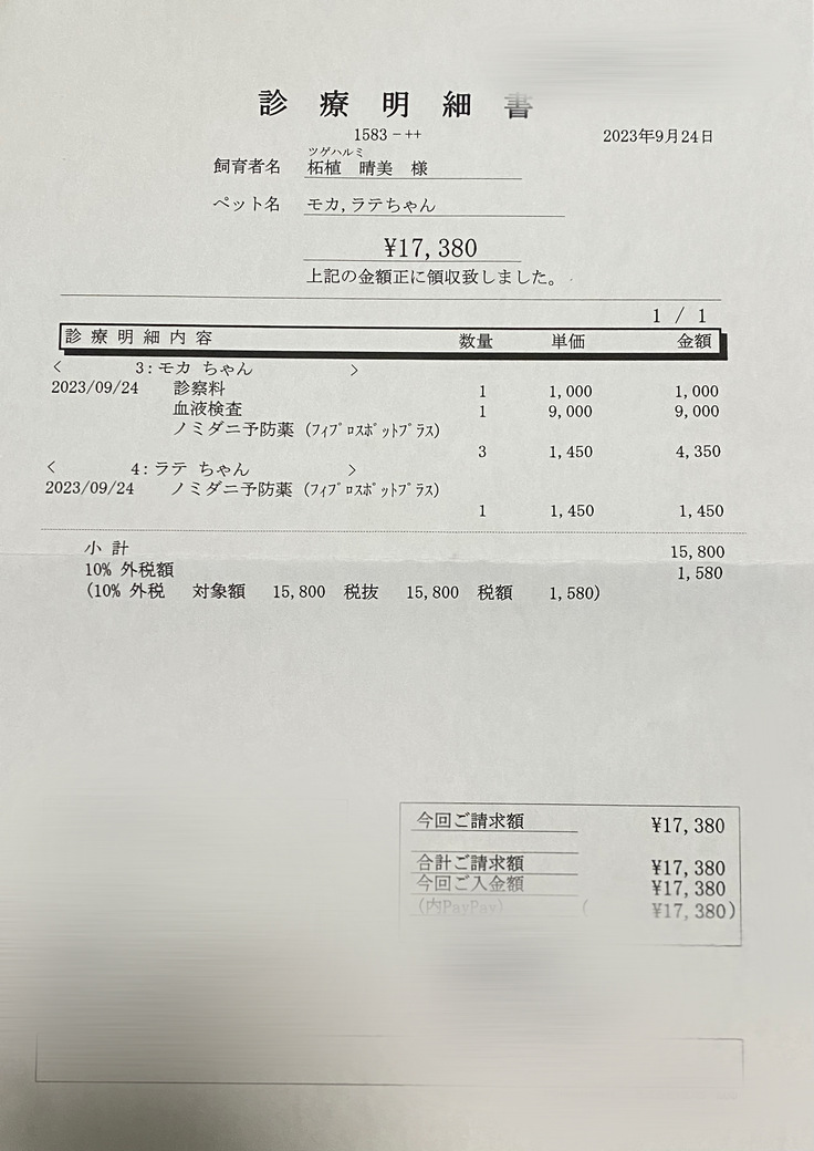 モカの欄にノミダニ予防数量(3)となっておりますが、きんとぎんの分が含まれています。