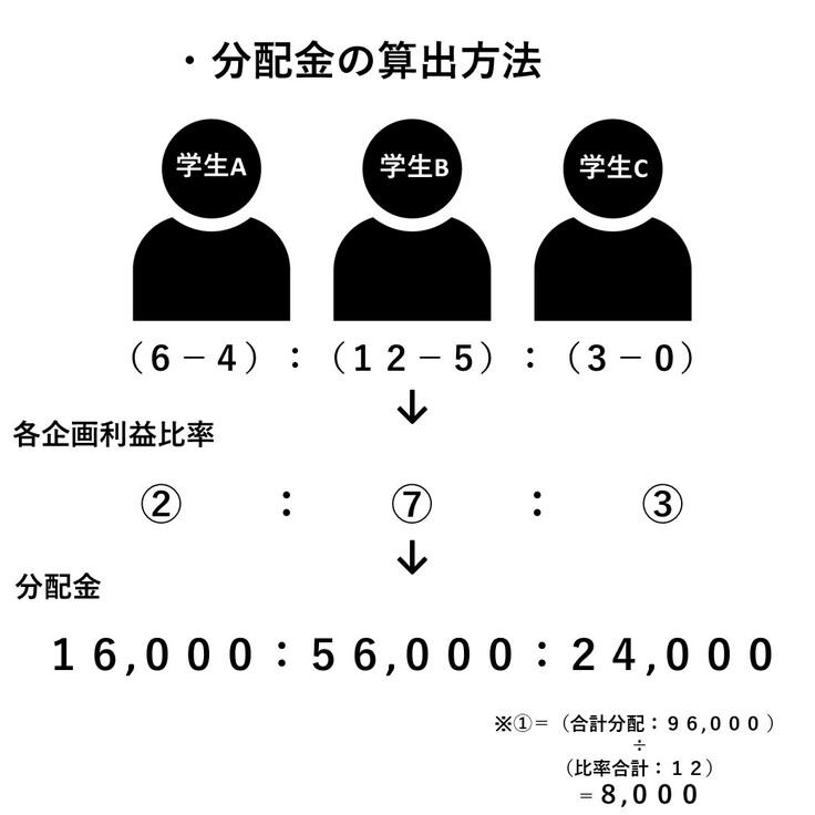 その売り上げをイベント全体にかかる費用で差しいて算出された利益を各企画の利益率に応じて分配をします。