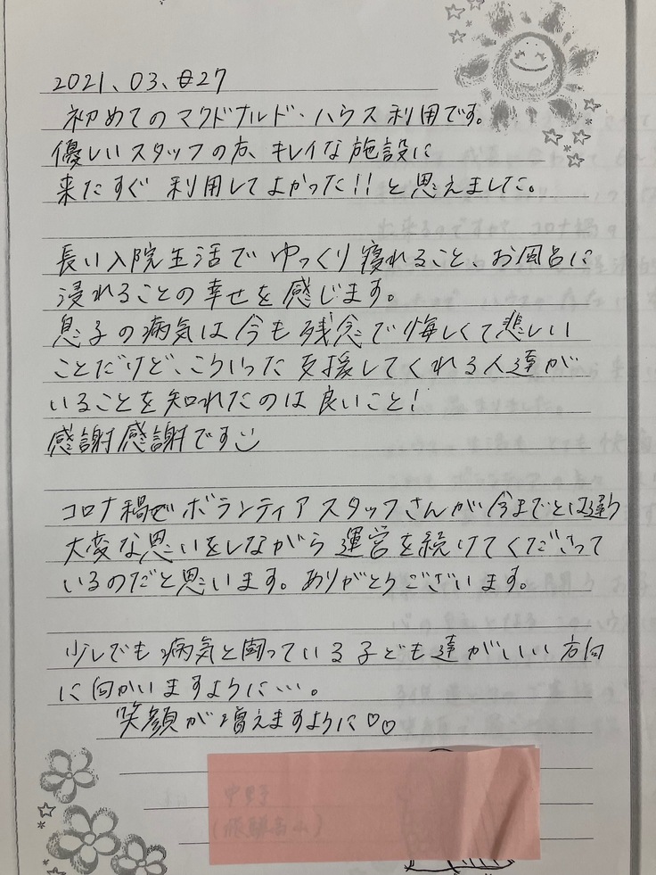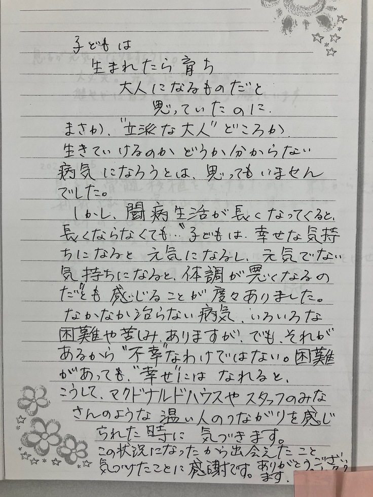 病気で長期入院している子どもたちはもちろんですが、そのご家族も精神的・肉体的・経済的に大変困難な状況におかれています。是非とも温かいご寄付をよろしくお願いいたします。