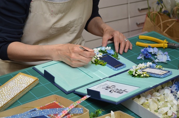 制作にかかる時間、半日かかります。最も手間のかかるのは花のセレクト、寸法の決め方です。花は寸法がまちまちでフォト上に使用するため、カットしたり花びらを足すなど加工が大変なのです。