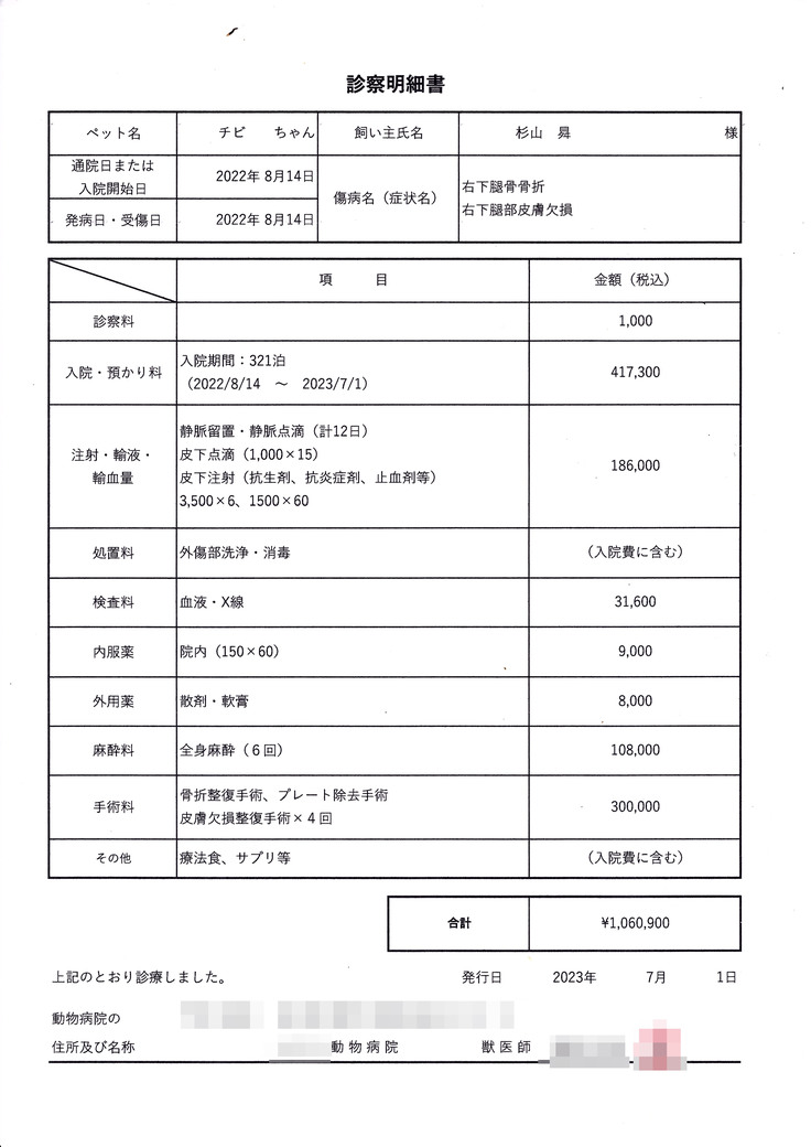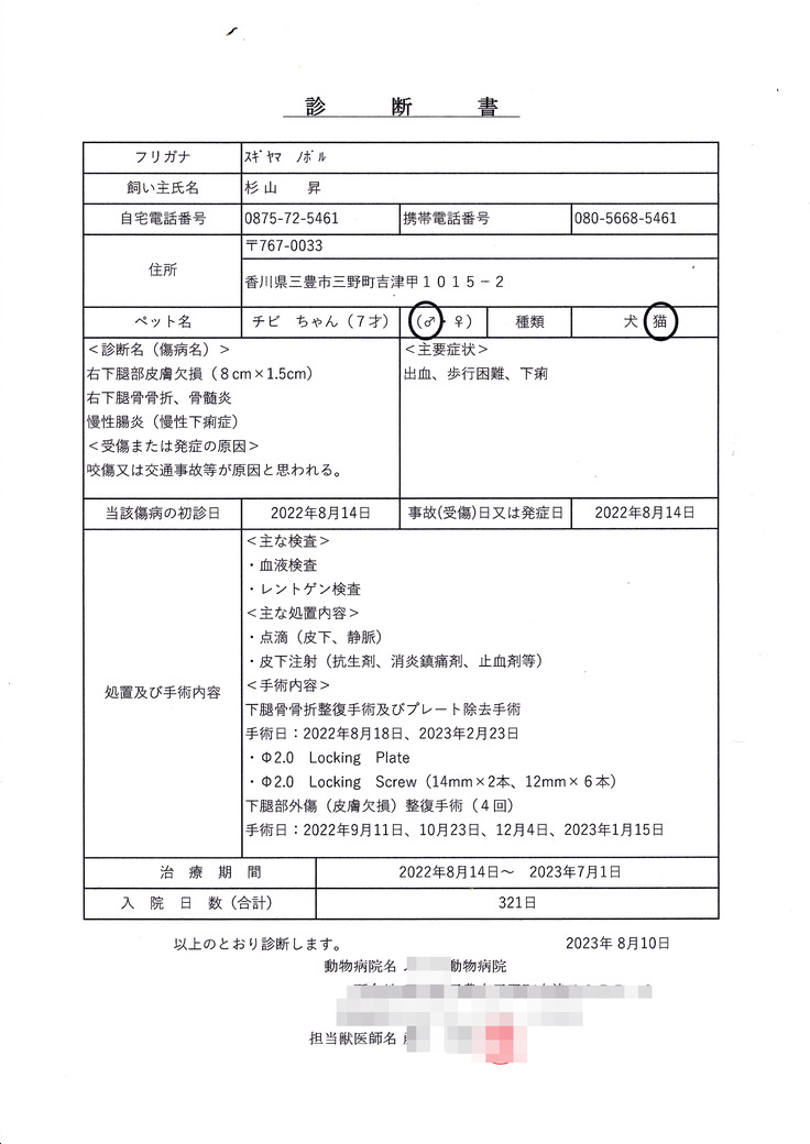 ページ上に掲載している診断書や診療明細書などの資料は全て動物病院から掲載の許諾を得て掲載しております。