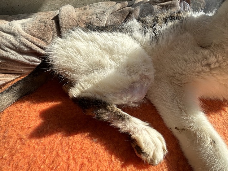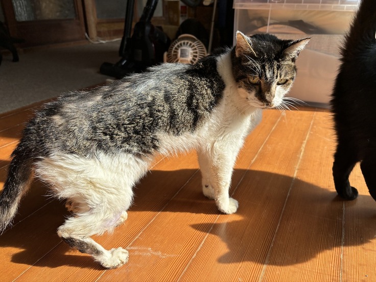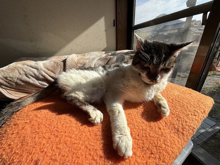 チビは退院して6ヶ月になりますが、まだ脚の感覚が戻って無いようで歩いている途中で脚を上げたまま止まったりすることがありますが、ケージから出るとアチコチ歩いて、温かいサンルームまで行って日向ぼっこしています。