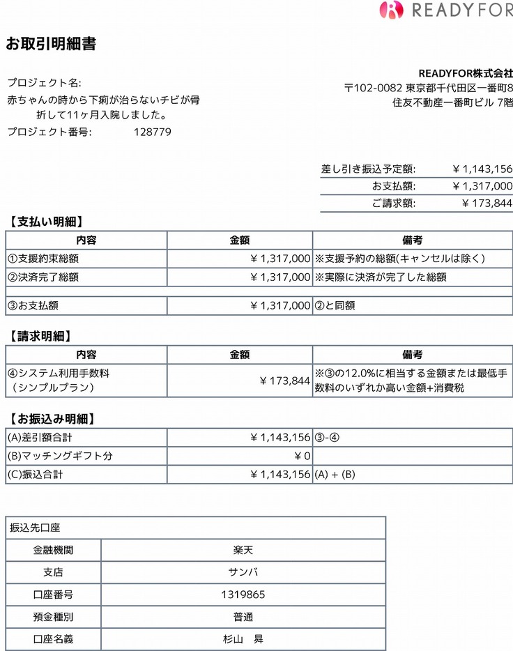 皆様のご支援金 ¥1,143,156-をREADYFORより1月10日に振り込み頂きました。