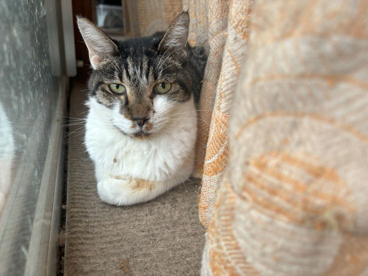 今日は曇っていますが、今日も窓際のカーテンの裏に居ます。