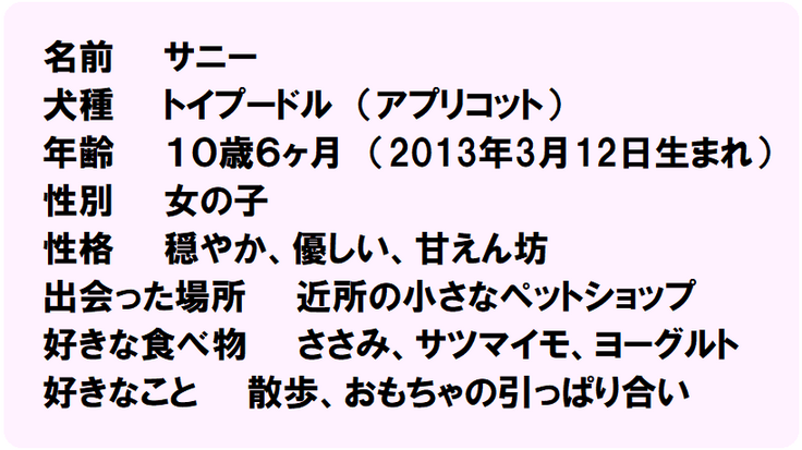 その後、春にかけて時々咳をしていたので、調べてみると気管支や心臓の病気の可能性があると書かれていました。心配になり病院で診ていただきました。年齢も10歳になったばかりだったので、ワンドック(全身の健康診断)もお願いしました。レントゲン、エコー、血液検査などの結果は「どこも悪いところはないですよ!軽い気管虚脱から咳が出るのでしょう。心臓の音もきれいですから心臓病ではないですよ。」と言われすっかり安心していました。その時、「咳は出るけれど、ひどくなったら気管支拡張剤を服用しましょう」とのことでしたので、サニーの咳は付き合っていくものだと思い込んでしまい、徐々にひどくなっていく咳の症状を深刻に受け止められませんでした。