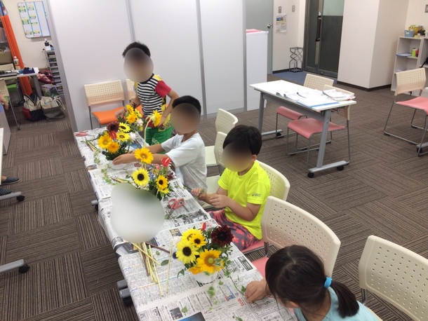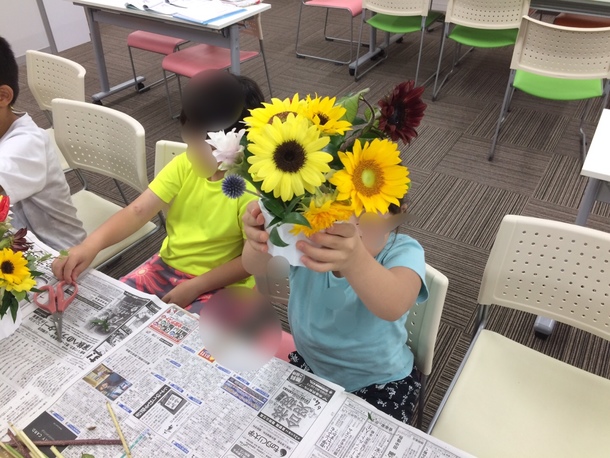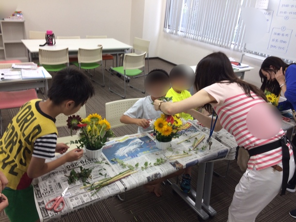 子供たちは、初めての生花アレンジに興奮しながら、ハサミを使って、茎の長さを上手に調整して切ったりし、