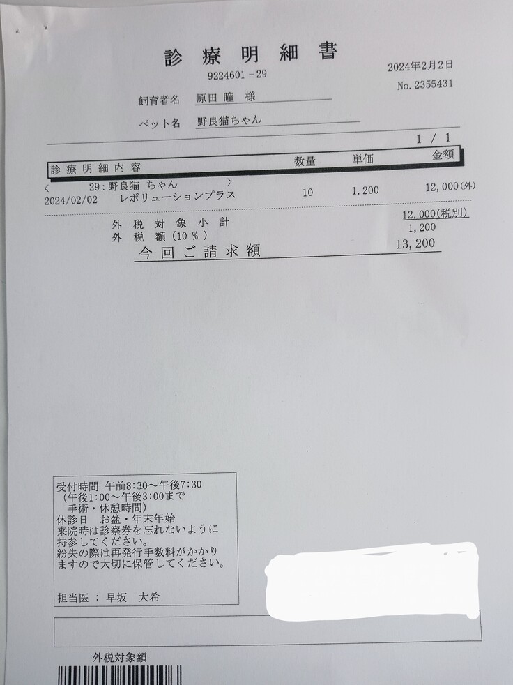 3匹分で、22.176円でした!野良猫ちゃん達のノミ取りの薬代が、10匹分で、13,200円でした。先日で薬を買った分は4,125円でした。合計で39,501円になりました。ありがとうございます🙇