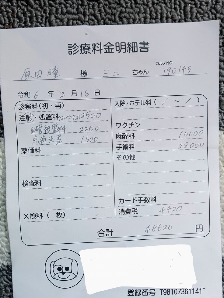 血液検査と手術の費用の領収書です。手術したばかりで、右の頬が腫れています😭ご飯は食べれています🙏