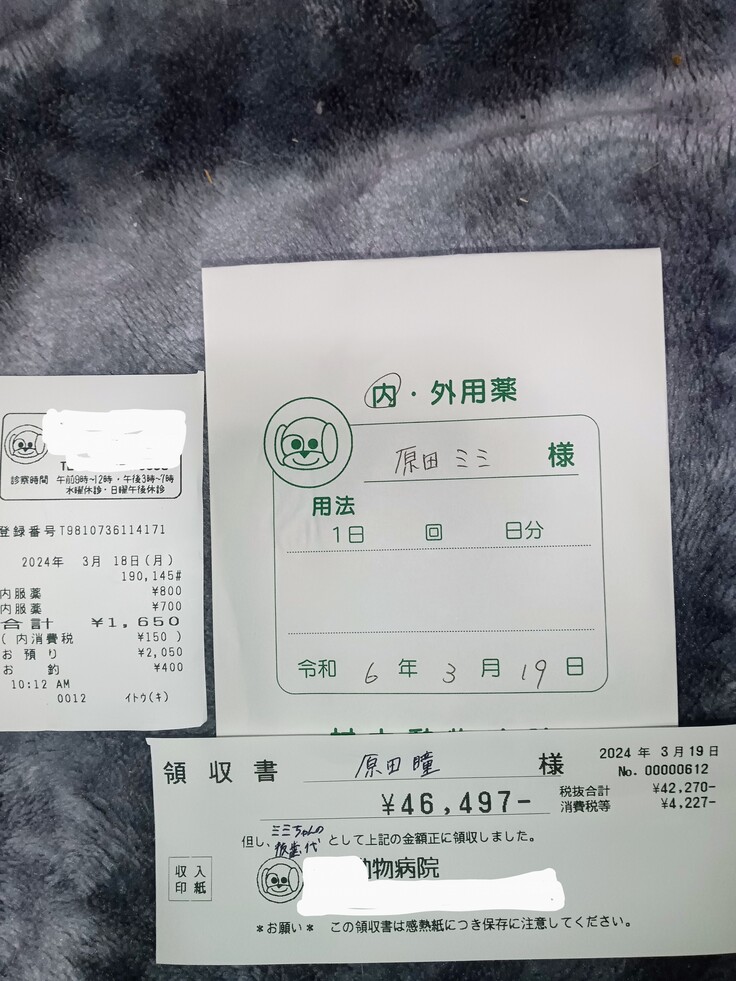 ミミちゃんの手術費と病院の薬代とお買い物の明細書です!沢山の美味しいご飯をありがとうございました🤗