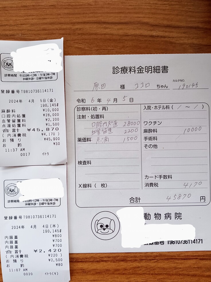 すいませんでした、ココロ君の抜歯の金額載せるのを忘れていました🙏本当にありがとうございます😀